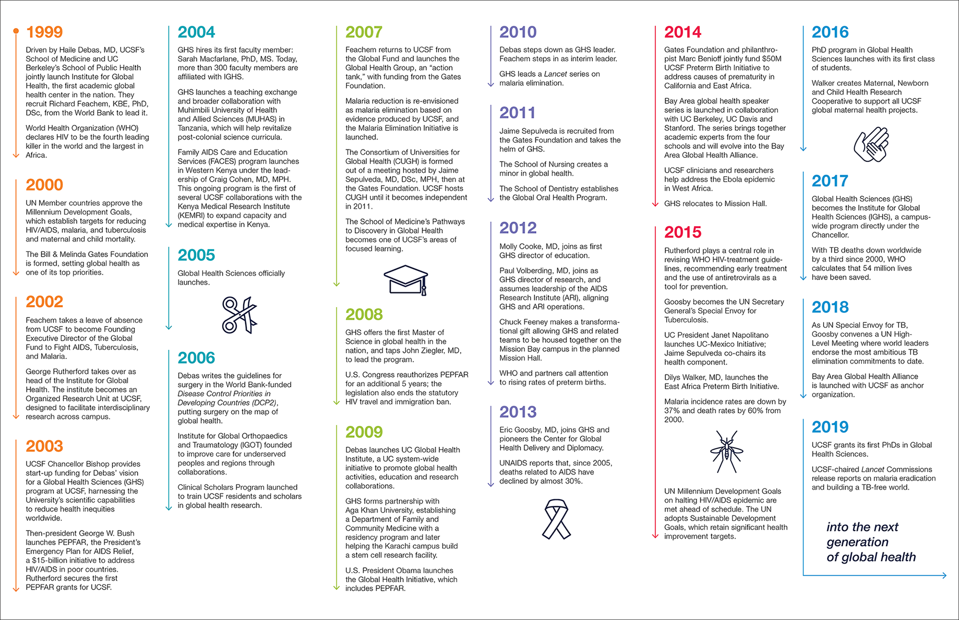 The foldout shows data about global health work at UCSF. Produced for the UCSF Institute for Global Health Sciences (IGHS). The timeline was created for IGHS' 20th anniversary.